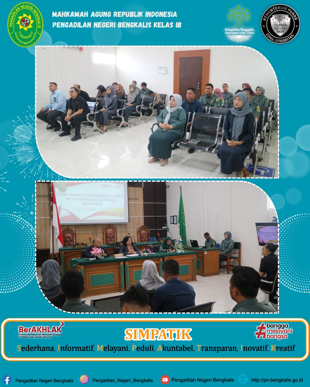 BENGKALIS - HUMAS, Bengkalis (23 Desember 2025) Pengadilan Negeri Bengkalis menggelar rapat bulanan pada hari ini di Ruang Sidang Utama Pengadilan Negeri Bengkalis. Kegiatan rutin tersebut dipimpin langsung oleh Ketua Pengadilan Negeri Bengkalis, Ibu Lenny Lasminar S.H., M.H. dan dihadiri oleh seluruh pejabat struktural, hakim, serta pegawai di lingkungan Pengadilan Negeri Bengkalis.