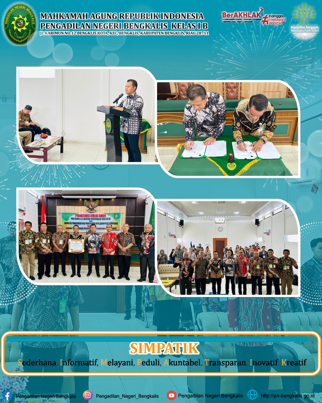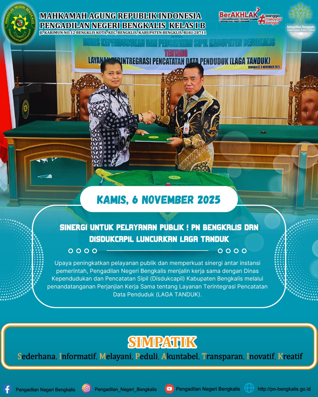 Bengkalis, 6 November 2025- Dalam upaya meningkatkan pelayanan publik dan memperkuat sinergi antar instansi pemerintah, Pengadilan Negeri Bengkalis menjalin kerja sama dengan Dinas Kependudukan dan Pencatatan Sipil (Disdukcapil) Kabupaten Bengkalis melalui penandatanganan Perjanjian Kerja Sama tentang Layanan Terintegrasi Pencatatan Data Penduduk (LAGA TANDUK).